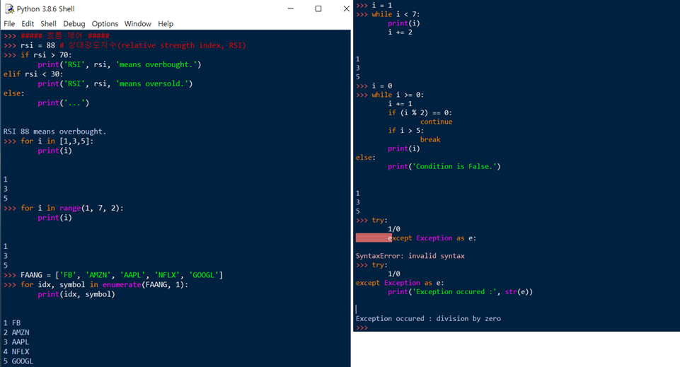 - while과 for 반복문에 else 문을 같이 쓰면 반복을 종료하고 특정 문장을 실행할 수 있음